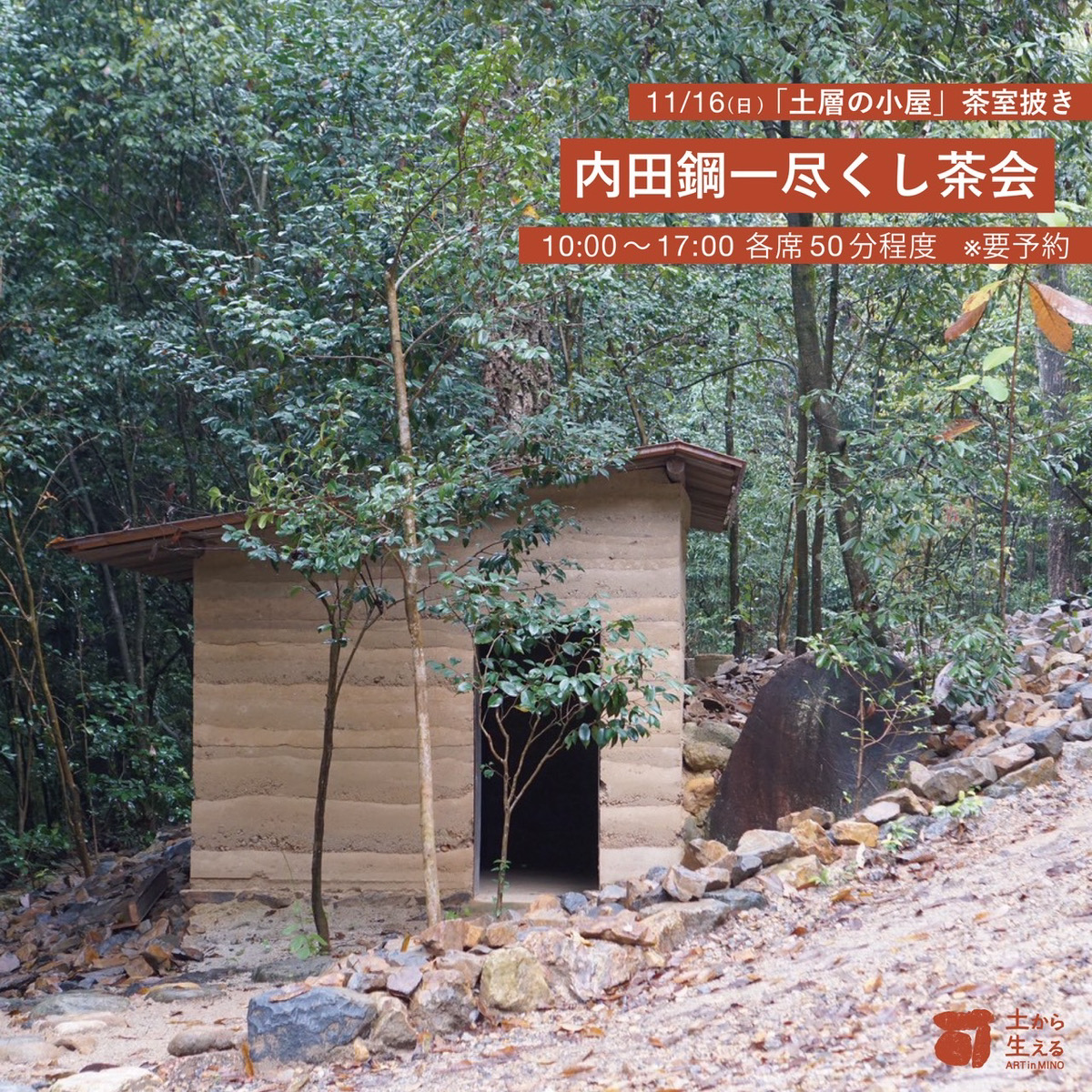 そして、2008年、2024年と続けて「土から生える」に参加されている内田鋼一氏の作品を使った茶会がギャルリ百草で開催されます。場所は、土から生えるの会期中も制作を進めていた内田鋼一作品「土層の小屋」です。完成を記念した茶室披きの茶会です。