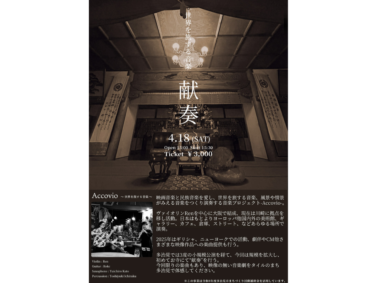 タイルの祖・山内逸三さんの菩提寺である「清昌寺」にて映画音楽と民族音楽を愛し、世界を旅する音楽、風景や情景がみえる音楽をつくり演奏する音楽プロジェクト Accovio(アコヴィオ) による特別公演が開催されます。