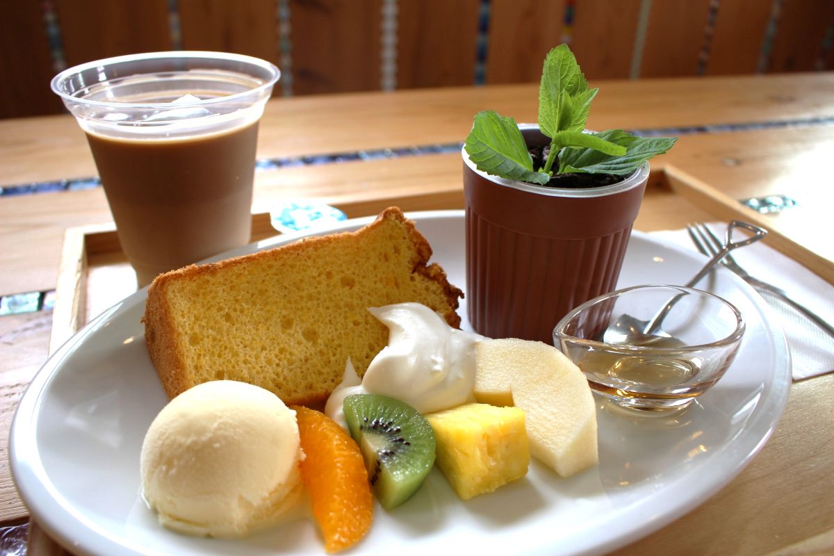 食後にはデザートプレートとドリンクが運ばれてきました。この日はシフォンケーキにアイス、季節のフルーツ、そしてプリンがのっていてボリューム満点!プリンは植木鉢に見立てていて、ザクザクしたクッキー生地で土を表現、自家栽培の無農薬ミントが顔をのぞかせます。スコップ型のスプーンで食べるのが楽しい!おなかもいっぱいでしたが、デザートは別腹!甘さがちょうどよく、とてもおいしかったです。