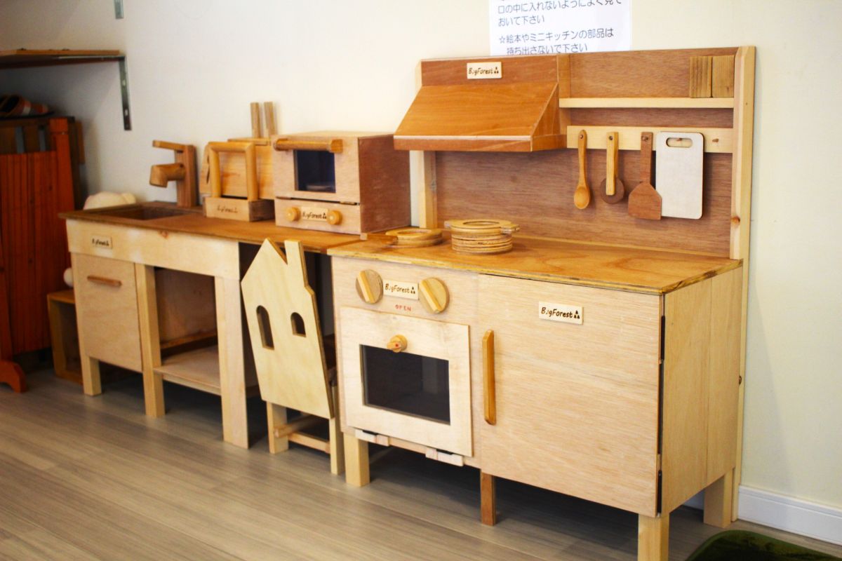 個室にも霞さんの手作り品があふれています。中でもミニチュアキッチンセットや絵本ラックの可愛さにくぎ付けに!子どもが遊ぶ時にケガをしないように、一つひとつヤスリで丸みがつけてあり安心です。