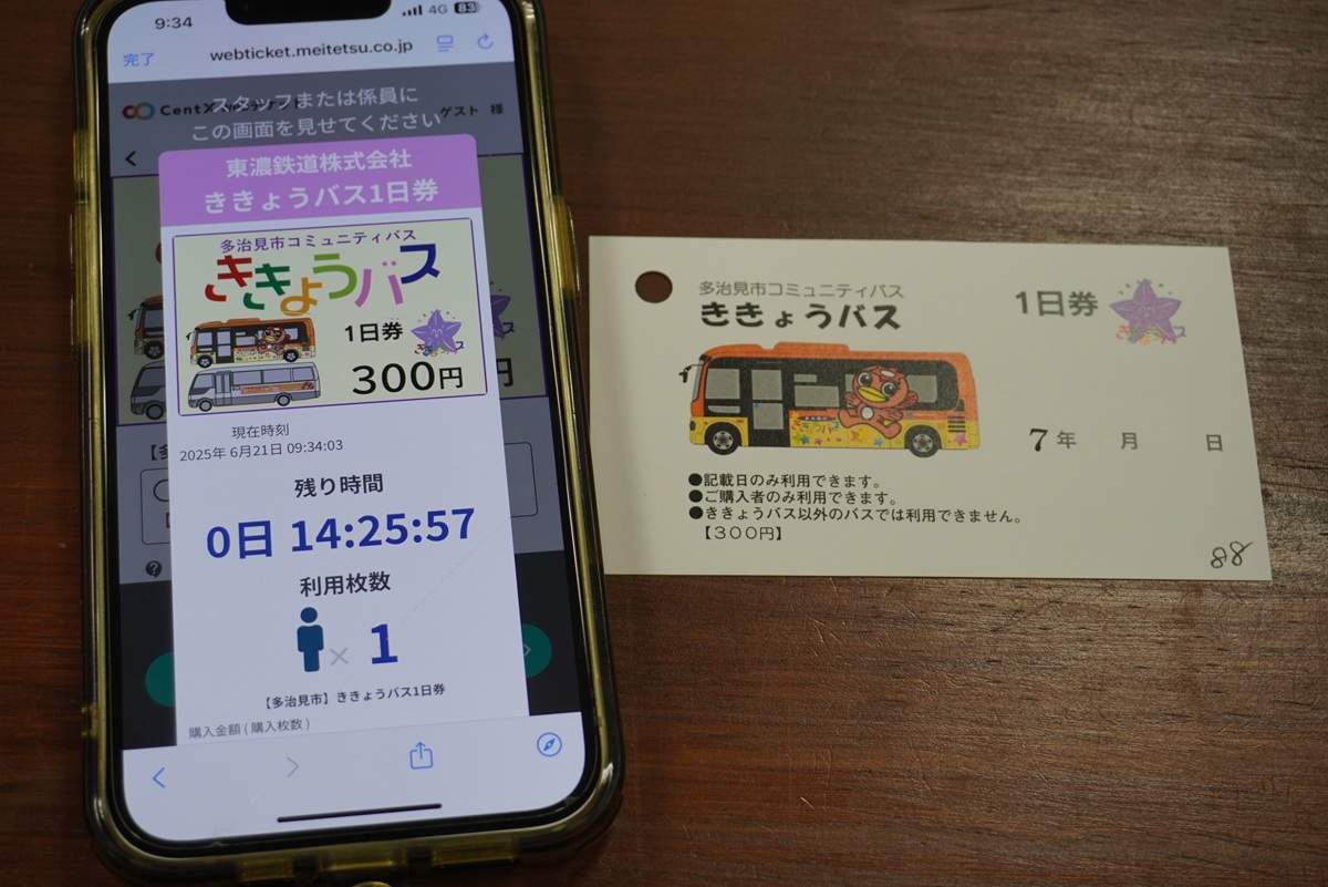 チケットは多治見駅観光案内所、ききょうバス車内で販売。名鉄公式アプリ「CentX」からデジタルチケットも購入可