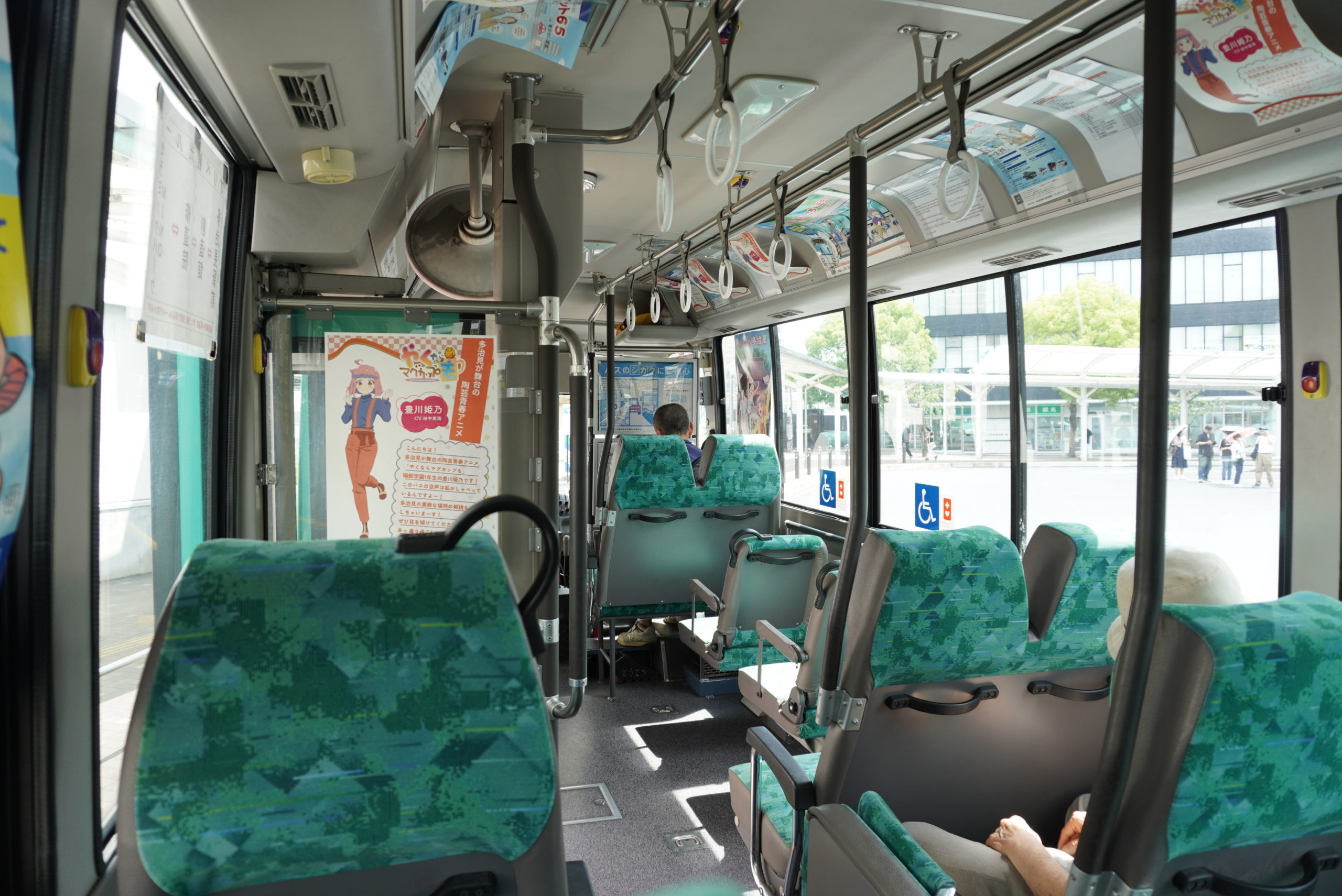 「ピンポーン!」出発すると聞こえてきたのは、かわいい女の子のアナウンス。実はこのオリベ観光ルートのアナウンスは、多治見市を舞台に陶芸に打ち込む女子高生たちの姿を描いた青春アニメ「やくならマグカップも」の主人公・豊川姫乃(とよかわひめの)が担当しています。