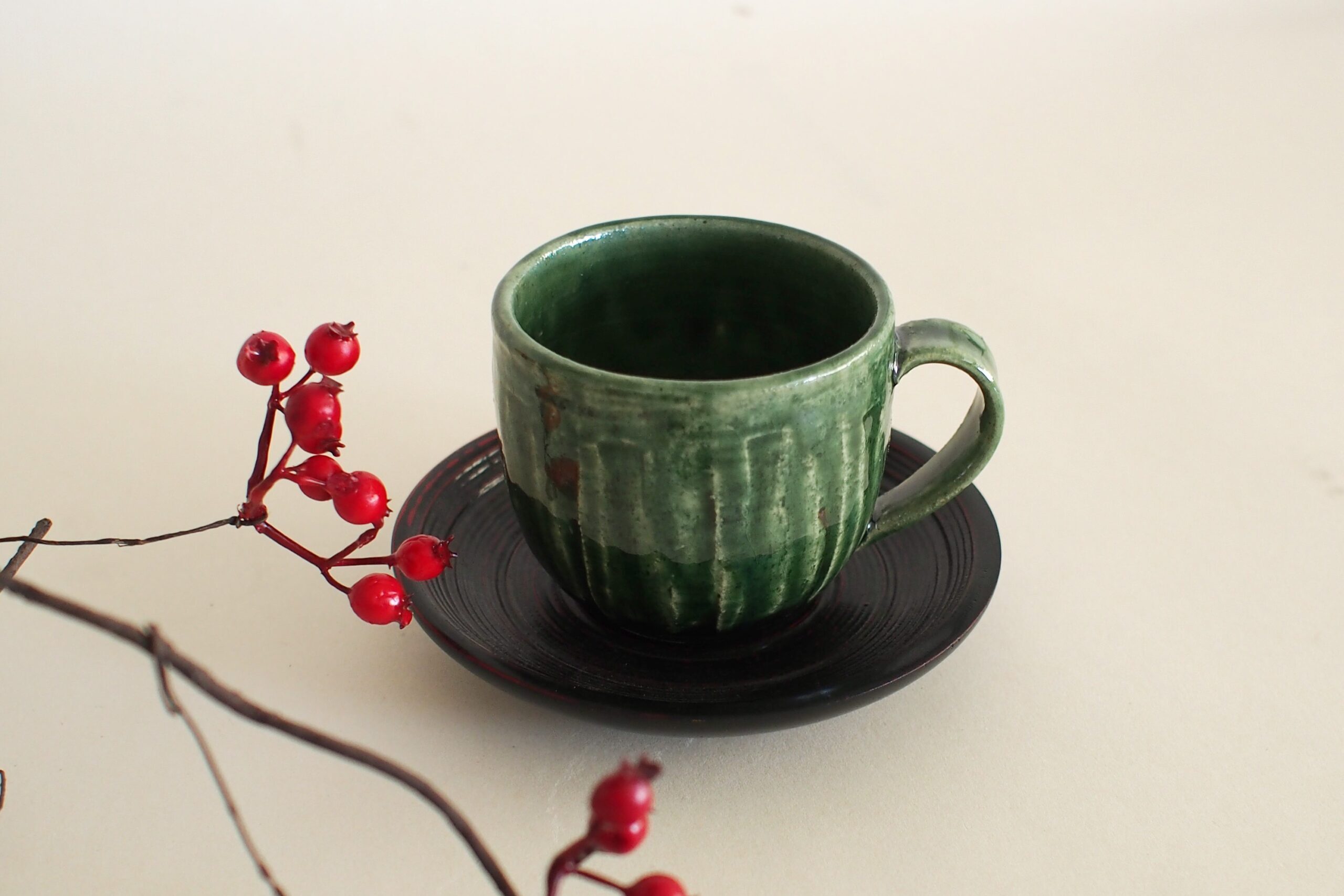 美濃焼特有の美しい織部釉が印象的な碗に木製の茶托を組み合わせた碗皿です。
