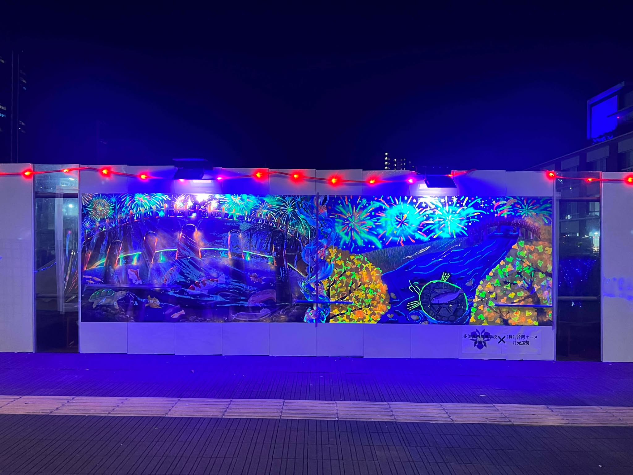 昼間は、土岐川に棲む魚たちが今にも飛び出してきそうな迫力ある絵を。夜には、花火が打ち上がり、もみじが光り輝く幻想的な表情を見せるように制作しました。