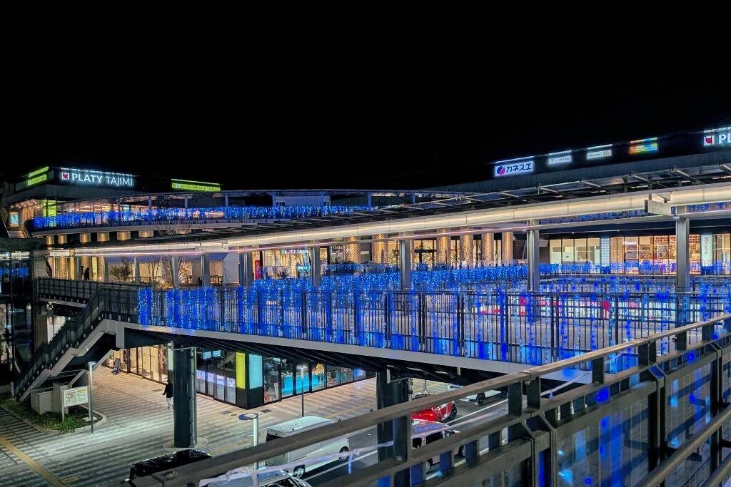 多治見駅南の商業施設プラティ多治見と駅舎を直結する、ペデストリアンデッキには青色と白色の電飾が施され、幻想的な世界を感じることができます。