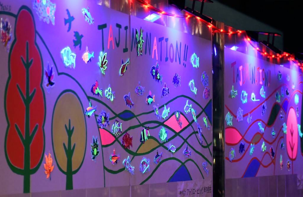 多治見市役所本庁舎予定地の壁には、点灯式前に開催されたワークショップで生まれた魚たちが貼られています。型紙となった魚は、土岐川や虎渓用水に生息しているオイカワ、コイ、タモロコの3種類。昼間は、色とりどりの魚が並ぶ、まるで水族館のようなにぎやかな風景。夜になると、魚や絵がブラックライトに照らされてふわりと浮かび上がり、昼とはまったく違う表情を楽しむことができます。