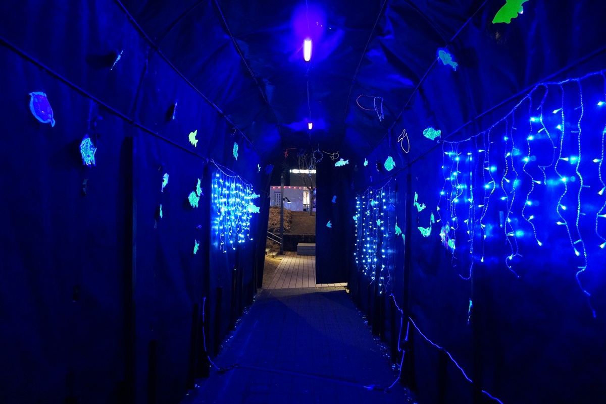 黒い幕に覆われたトンネルには、点灯式のワークショップに参加した皆さんが制作した、光る魚たちがずらり。ひとつひとつ異なる表情の作品が、イルミネーションにあたたかな彩りを添えています。