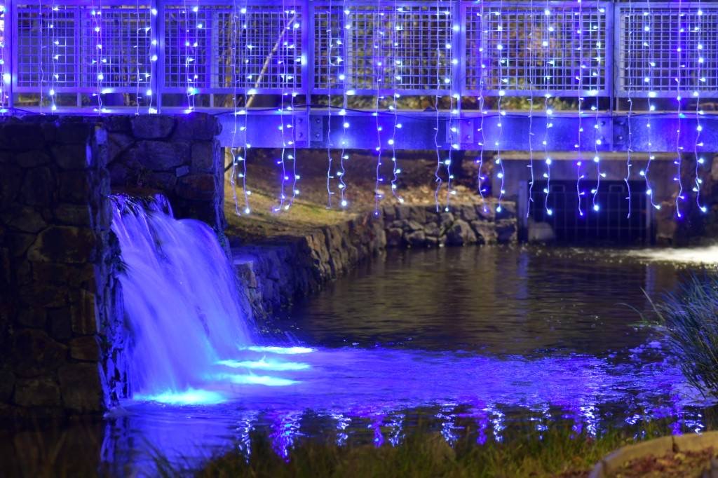 広場内の水路に取り付けられたイルミネーションは、水面に反射してきらめき、橋の上から滴り落ちるような光は、滝の流れをイメージした演出となっています。
