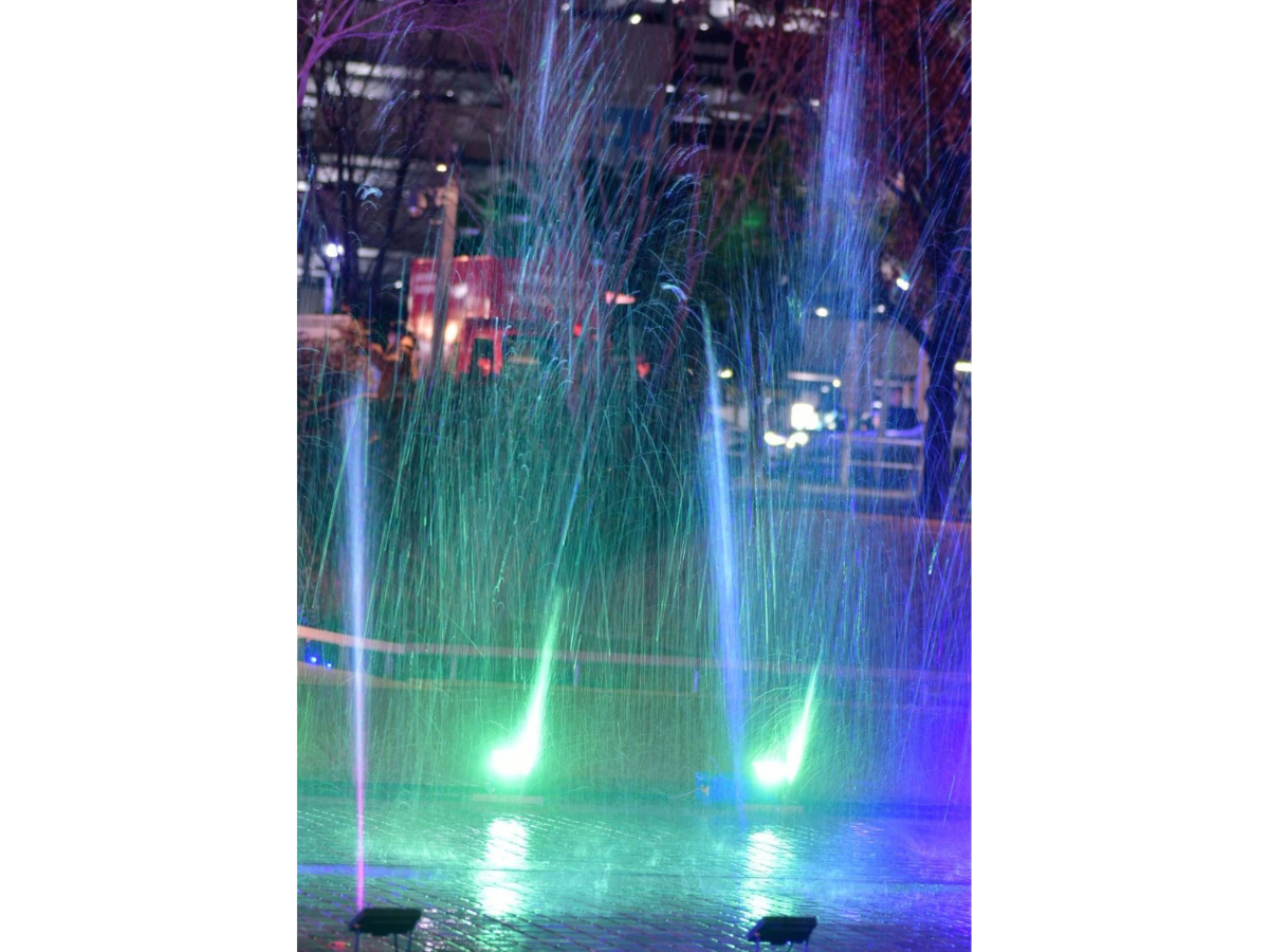 今年のテーマは「水と光のコラボレーション」。鮮やかな色に照らされた噴水や、広場内を流れる虎渓用水が光に照らされ、幻想的な空間が広がります。