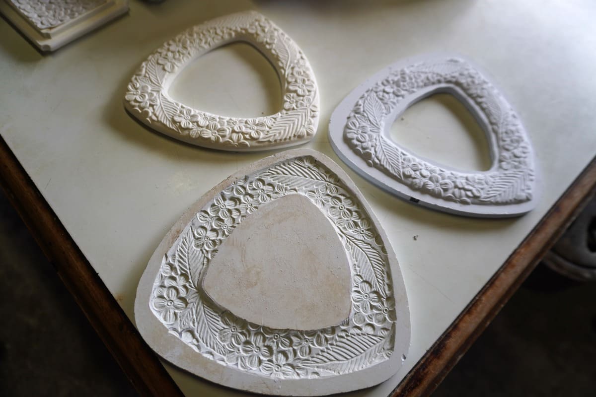 石膏は主に竹でできたヘラで削っていきます。まっさらな石膏から繊細な模様が浮かび上がる様子はまさに職人技そのもの。「ろくろなどの動力を使う方法だと裏側まで作れない、型屋ならではのデザインだよね」と吉川さんは笑顔で話します。
