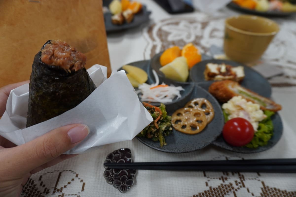 型づくりについて学んだあとは、待ちに待った昼食タイム。おむすび すずやのおむすびと、お惣菜が素敵な器に盛り付けられて用意されていました。先ほど原型を見せてもらった器や箸置きなど、作り方を知ったあとに手に取ると自然と器を見る目線も変わってきます。
