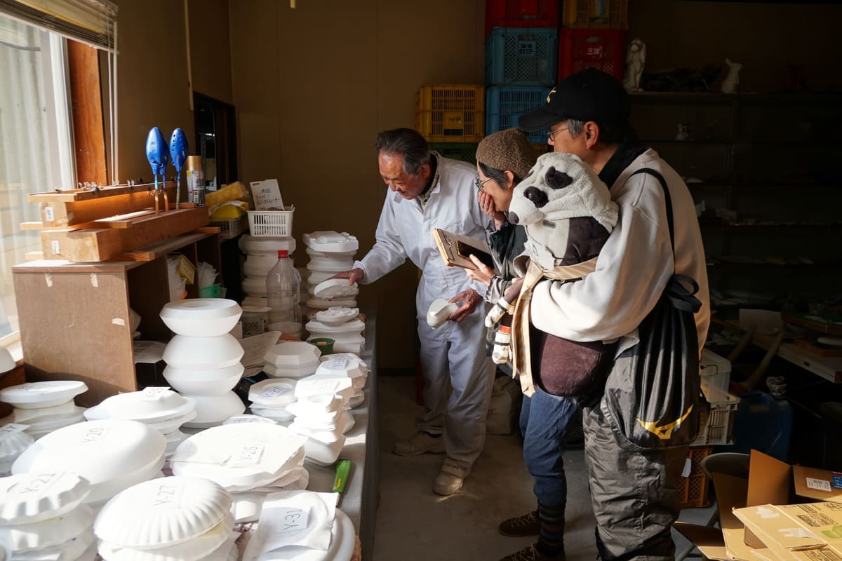 この日の見学会では私の他に、多治見るこみちリピーターの方と陶芸家の方が一緒に参加。普段から陶芸家の方が見学や相談に訪れることも多く、自作の型を持ち込んでアドバイスを求める人もいるそうです。