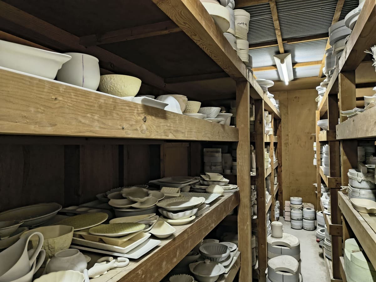 昼食後は、工房の奥にある倉庫へ。そこには、これまで吉川さんが手がけてきた皿やカップ、フィギュアなどの原型がずらりと並びます。まさに“原型の宝庫”です。