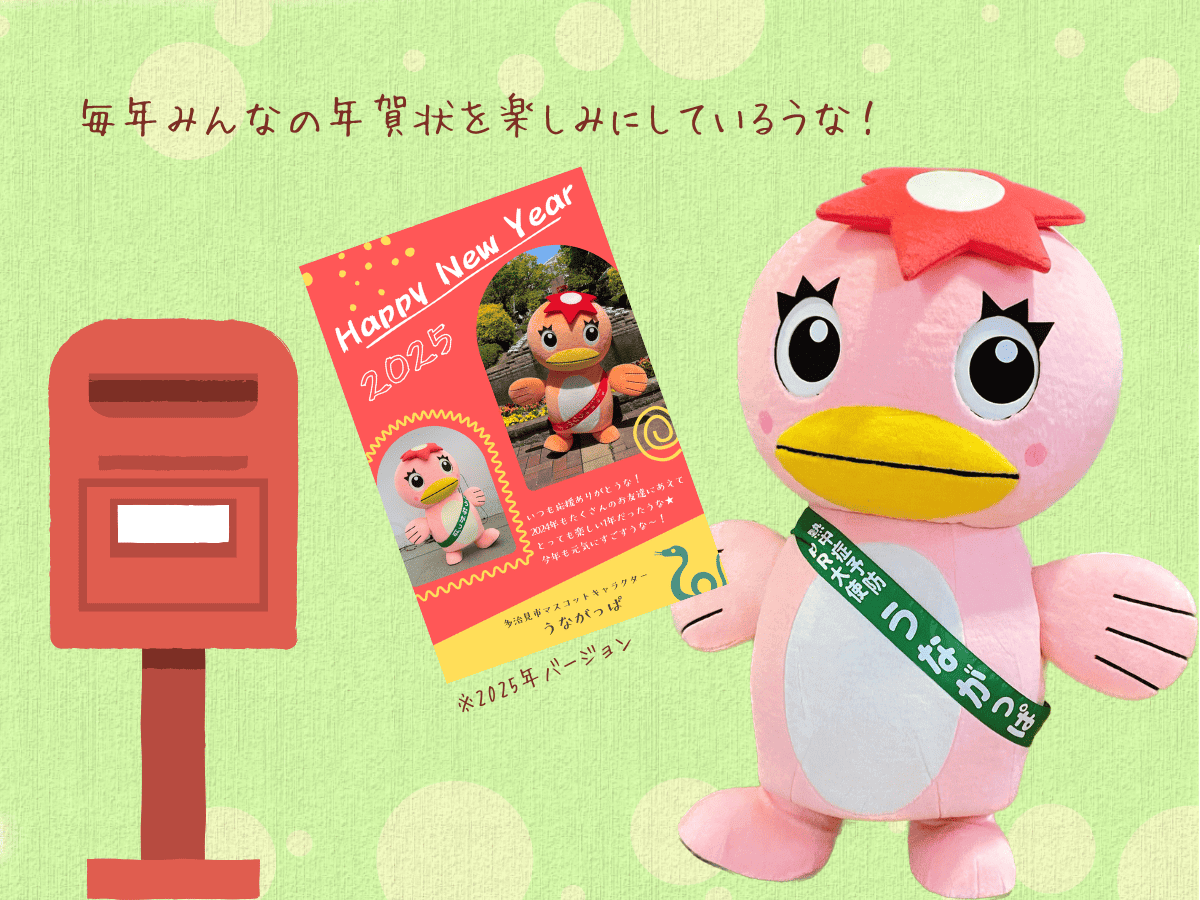 2025年も、うながっぱ宛にたくさんの年賀状をお送りいただきありがとうございました。届いた年賀状は、うながっぱくんが一通一通大切に読んでいます。年賀状の販売は終了しましたが、うながっぱくんからのお返し年賀状は心を込めてお送りします。今年もぜひうながっぱくんに年賀状を送ってみてくださいね!