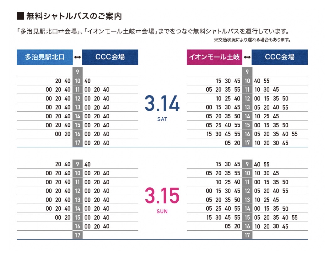 イオンモール土岐、JR多治見駅から会場までの無料シャトルバスを運行します。多治見駅近隣のコインパーキングに停めてから無料シャトル バスで来場もできます。
